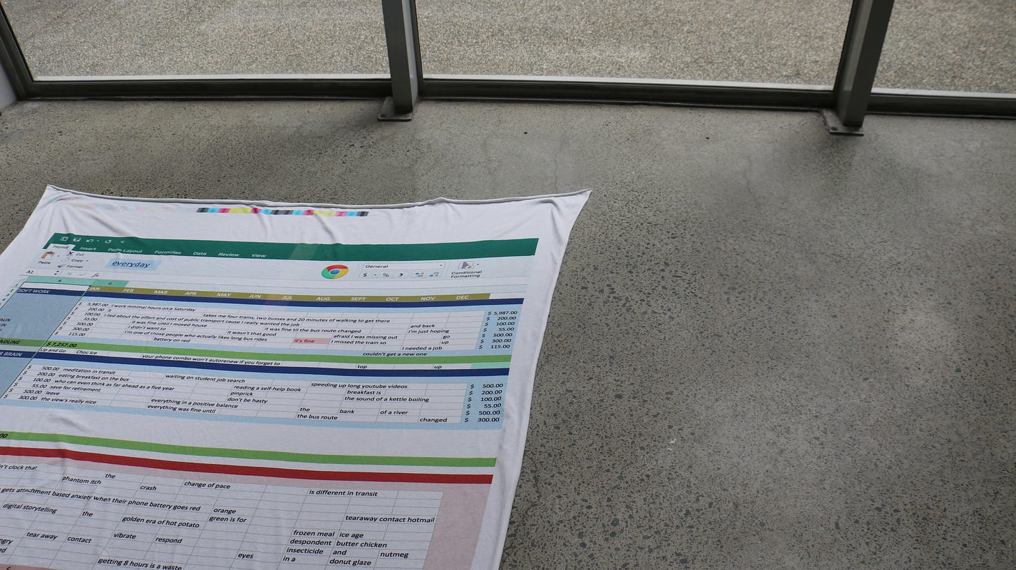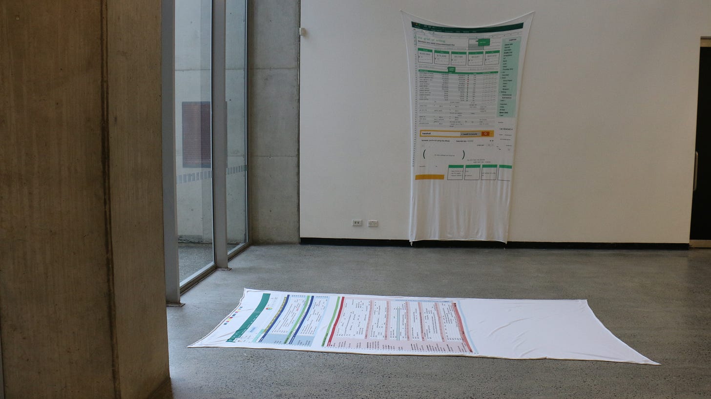 Vanessa: Thank you! The Excel spreadsheets you see in AUP New Poets 6 were originally printed on these large fabric sheets that were displayed in St Paul St Gallery Three at my graduating exhibition, on the floor and pinned to the wall. These got shrunk and re-presented in page form for the collection with Auckland University Press.